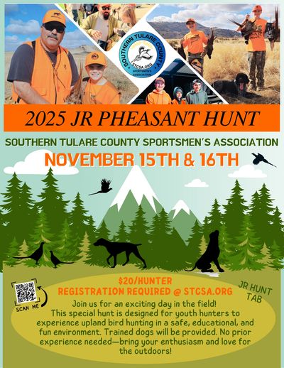 The Southern Tulare County Sportsmen’s Association (STCSA) Junior Pheasant Hunt is a special event designed for young hunters to experience the excitement of hunting while learning essential skills and values. This event emphasizes hunter education, safety, and the importance of camaraderie among participants.